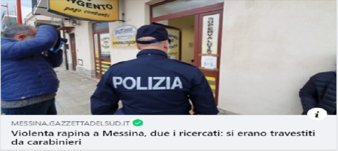 Intorno alle 13.00 di oggi, nel villaggio di Sant’Agata a Messina vi è stata una rapina eseguita con modalità violente. Dalle prime ricostruzioni effettuate dagli inquirenti, è emerso che due persone, a quanto pare travisate da carabinieri ed armi in pugno hanno fatto irruzione all’interno di un Compro Oro con il fine di immobilizzare i dipendenti ed impossessarsi di preziosi e denaro.