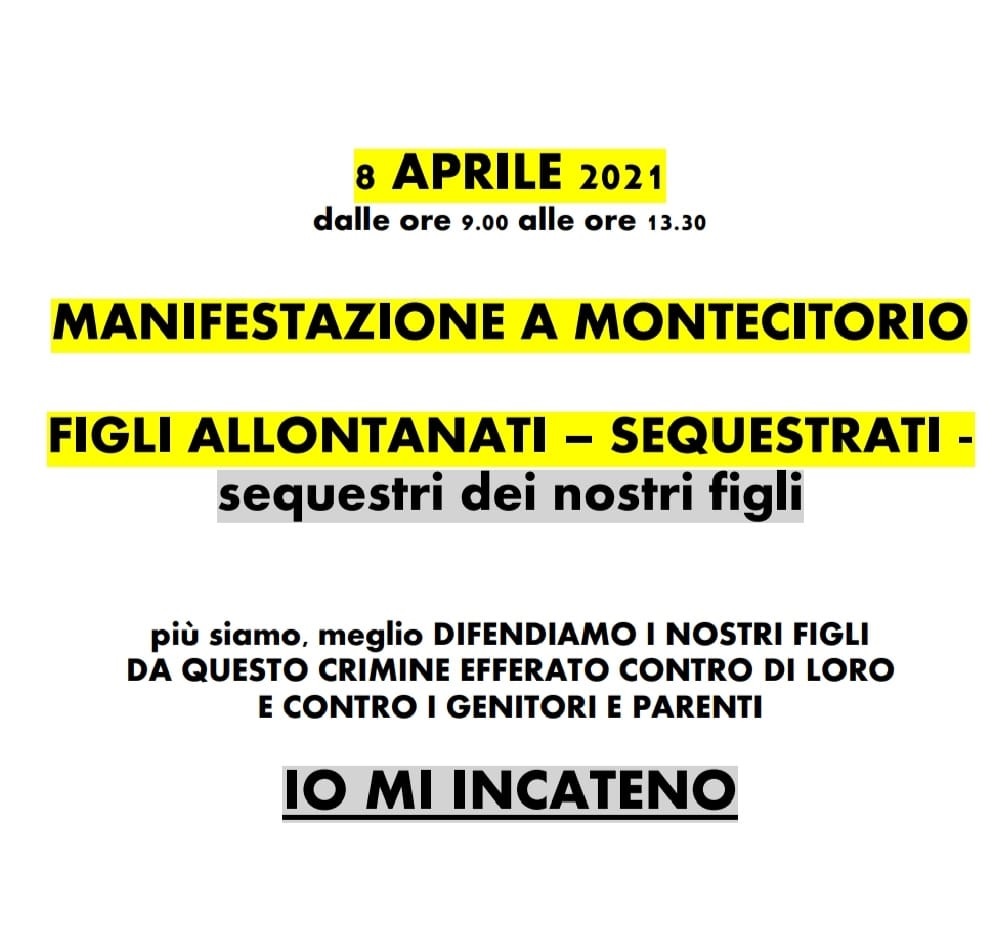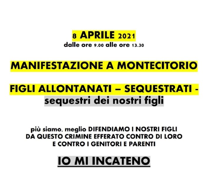 L’8 aprile 2021 dalle ore 09.00 alle 13.30, si terrà una manifestazione a Montecitorio (Roma) sui figli allontanati e sequestrati. Ad annunciarlo oggi su Facebook…, è la mamma romana Giada Giunti che da dieci anni vive separata dal figlio a causa di illeciti provvedimenti giurisdizionali minorili emessi dai giudici del Tribunale e della Corte d’Appello minori… in violazione della Legge.