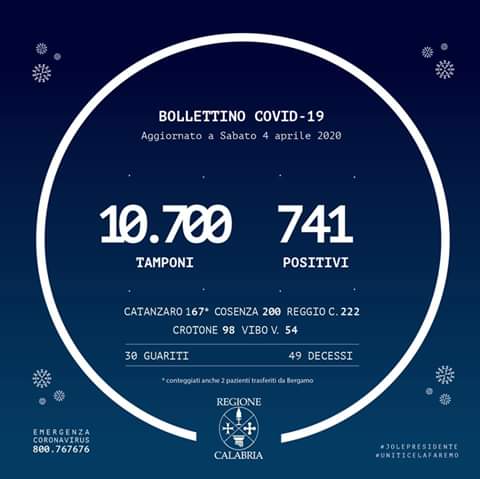 In Calabria ad oggi sono stati effettuati 10.700 tamponi. Le persone risultate positive al Coronavirus sono 741 (+8 rispetto a ieri), quelle negative sono 9959.