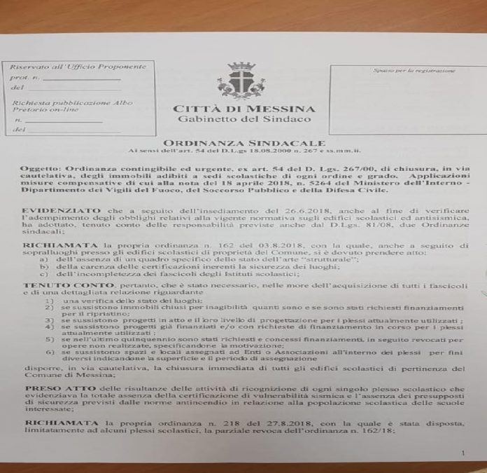 L’onorevole Cateno De Luca, sindaco di Messina, ha emanato ieri un ulteriore provvedimento sui plessi scolastici, ai sensi dell’articolo 54 del Decreto Legislativo 267/2000.