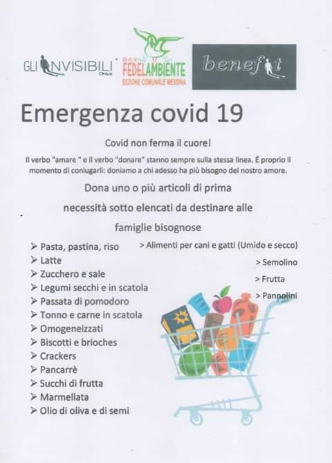 In questo periodo di pressante emergenza sociale, che accompagna l’emergenza sanitaria, sono diverse le associazioni di volontariato che si stanno impegnando per aiutare persone e nuclei familiari in difficoltà. In quest’ottica va inquadrato anche il nostro progetto per aiutare le persone in grave difficoltà economica che non possono far fronte alle spese necessarie per superare dignitosamente questo momento d’ isolamento, progetto denominato ‘Covid non ferma il cuore’. I volontari sono già attivi da vari giorni, pronti a raggiungere oltre 100 nuclei familiari, ai quali consegneranno le spese alimentari nei prossimi giorni, grazie ad un volontario autorizzato che girerà per le vie di Messina a recapitare a domicilio le buste, seguendo rigorosamente le norme igienico sanitarie occorrenti. Sostenere O.D.V. ‘Fedelambiente’ Onlus ed il progetto medesimo è possibile attraverso la seguente modalità: -Donazione tramite IBAN IT16R0895225900000000162336. Causale: COVID NON FERMA IL CUORE, sez. Messina.