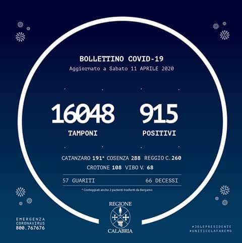 Nel conteggio sono compresi anche i due pazienti di Bergamo trasferiti a Catanzaro, mentre non sono compresi i numeri del contagio pervenuti dopo la comunicazione dei dati alla Protezione Civile Nazionale.