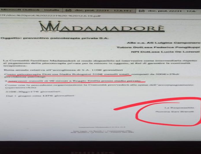 “La responsabile di MADAMADORE scrive quindi al Servizio Minori di Mirandola, rendendosi -disponibile ad intervenire come intermediaria al pagamento della psicoterapia privata per la minore in oggetto-“.