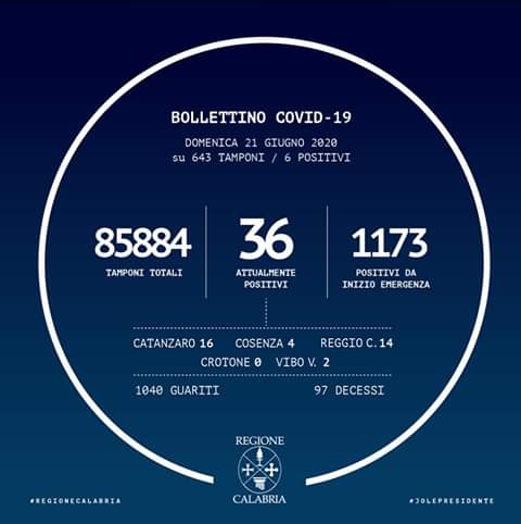– Cosenza: 1 in reparto; 3 in isolamento domiciliare; 430 guariti; 34 deceduti.