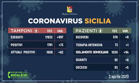 Questo il quadro riepilogativo della situazione nell’Isola, aggiornato alle ore 17 di oggi (giovedì 2 aprile), in merito all’emergenza #Coronavirus, così come comunicato dalla Regione Siciliana all’Unità di crisi nazionale.