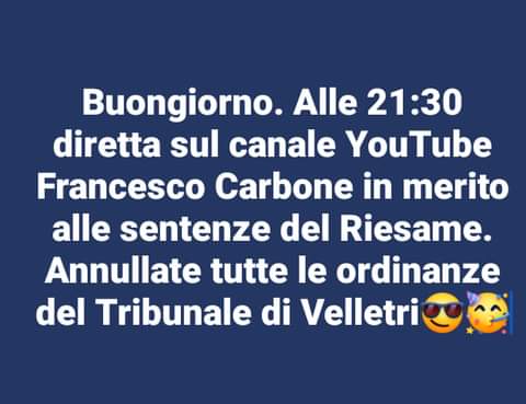 “I giudici del Tribunale del Riesame hanno annullato tutte le illecite ordinanze nei miei confronti, emesse dal Giudice del Tribunale di Velletri Tirone e dal Procuratore Capo Patrone. Questa sera vi spiegheremo tutto ciò che potrà succedere prima dell’udienza di giorno 18 settembre o in tale udienza visto e considerato che abbiamo ottenuto l’annullamento di tutte le illecite ordinanze, abbiamo fatto anche istanza di Rimessione e Denuncia contro il Giudice e PM di Velletri, Primo dirigente della Polizia Mastrapasqua, Commissari e appartenenti della Digos e Polizia, medici dell’Ospedale Umberto Primo, presso la Procura di Perugia ancora ignorata dal Procuratore Capo di Perugia pur essendo stato sotto sequestro fino a oggi quale ultimo giorno”.