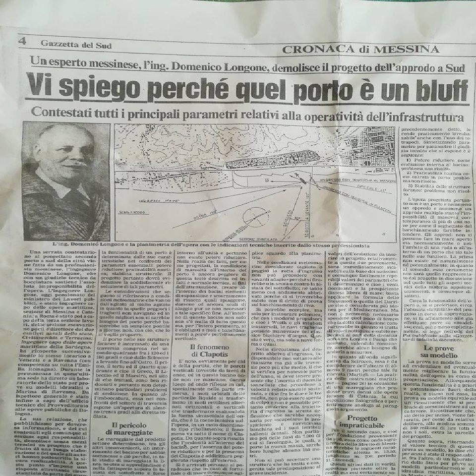 Mazzeo, scrive: “bene ha fatto il giornalista Alessio Caspanello a ricordare stamani con un articolo su Lettera Emme i -disastri progettuali- del secondo approdo a Tremestieri (Messina), di cui si sta avviando un costosissimo e in utile ampliamento. E’ opportuno tuttavia ricordare come già nel 1989 l’ex ingegnere capo delle Opere marittime della Sardegna, di Venezia e Ravenna, il messinese Domenico Longone, con una lunga relazione pubblicata dalla Gazzetta del Sud aveva spiegato come quello di un nuovo porto a Sud era un vero e proprio -bluff-, un -progetto impraticabile-, che sarebbe stato immediatamente -insabbiato dalle mareggiate-“.