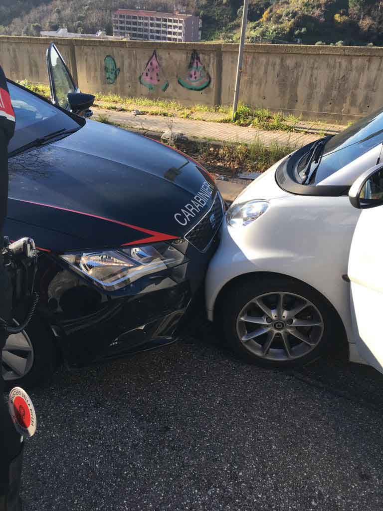 Il giovane percorreva a bordo di una Smart di proprietà di un familiare, viale Giostra ed alla vista di un posto di controllo dei Carabinieri del Nucleo Radiomobile che gli avevano intimato l’alt, repentinamente, invertiva la marcia e percorrendo contromano la via da cui proveniva, tentava di darsi alla fuga immettendosi successivamente a forte velocità nella galleria che collega il viale Giostra al viale Annunziata ed effettuando numerosi rischiosi sorpassi. I militari si ponevano all’inseguimento della SMART e tenendola sempre sotto controllo la seguivano nella sua lunga corsa attraverso le vie che si snodano alle spalle del viale Annunziata. La SMART attraversava poi l’arteria stradale e si immetteva lungo la via Cappellani e la via San Licandro ed infine, in via Olimpia, il veicolo veniva imbottigliato dai militari che gli serravano la via con le autoradio e lo costringevano a fermare la sua corsa tra l’autovettura di servizio ed il marciapiede.