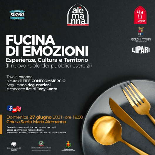 L’evento di sabato vuole essere la concretizzazione di questo connubio, in cui si fondono emozionalità, cultura, musica ed eccellenze del territorio. Perché i pubblici esercizi diventino sempre più teatro delle esperienzialità”. L’appuntamento è domenica 27 giugno a partire dalle 19 con la tavola rotonda “Fucina delle emozioni” dedicata al nuovo ruolo dei pubblici esercizi. Un momento di confronto promosso da Fipe Confcommercio a cui interverranno: Carmelo Picciotto, Presidente Fipe Messina e Confcommercio Messina, Dafne Musolino, assessore comunale alle Attività Produttive, Paola Sabella, Segretaria generale Camera di Commercio Messina, Marcello Startari, titolare Ristorante Bellavista di Messina, Floriana Lipari, titolare Salumificio Lipari di Gibellina (TP) e Tino Amovilla, responsabile commerciale della Tenuta Gorghi Tondi di Mazara del Vallo (TP). Seguirà una degustazione di salumi gourmet del Salumificio Lipari e dei vini Babbìo Bianco e Rosé della Tenuta Gorghi Tondi. Chiuderà la serata il concerto del musicista Tony Canto.