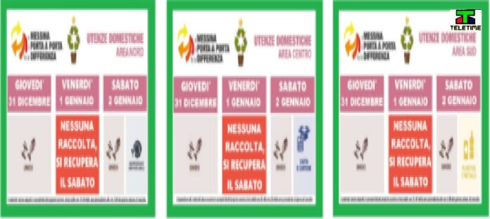Messinaservizi comunica i calendari per la raccolta di rifiuti dal 31 dicembre al 2 gennaio, in seguito verranno date altre informazioni per il resto delle festività. La vigilia di capodanno, il 31 Dicembre, che sarà prefestivo, non si potranno conferire rifiuti sia nelle Aree servite dalla raccolta differenziata, che nei cassonetti stradali dell’indifferenziata, perché giorno 1 gennaio non ci sarà nessuna raccolta.