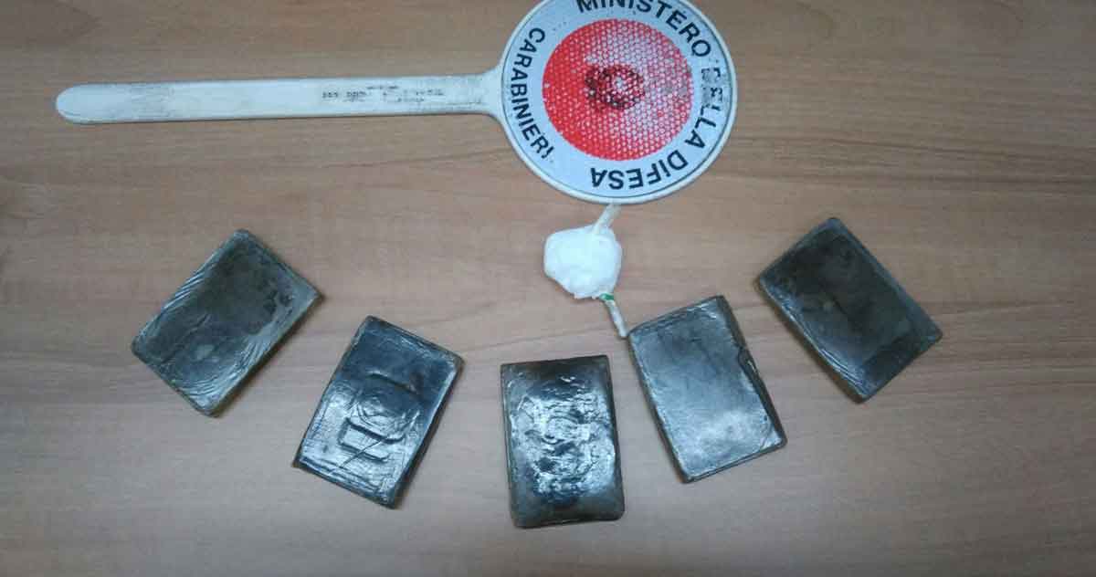 Nella circostanza, poiché i giovani mostravano particolari segni di disagio, i Carabinieri decidevano di sottoporli ad una accurata perquisizione personale e veicolare, a seguito della quale rinvenivano sulla persona di IANNIELLO Francesco, abilmente occultati, cinque panetti da 100 grammi ciascuno, per un peso totale di circa 500 grammi, di sostanza stupefacente tipo “hashish” ed un involucro contenente circa 11 grammi di sostanza stupefacente del tipo “cocaina”.