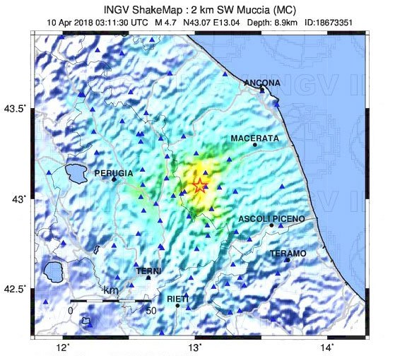 Muccia (Macerata) – Torna la paura terremoto nel maceratese. Una scossa di grado 4.7 con epicentro a 2 km da Muccia (Macerata) ed ipocentro a 9 km di profondità si è verificata alle 5:11 di questa mattina. La scossa è stata seguita da due sismi magnitudo 3.5 alle ore 05:46 e 06:03 nella medesima area, dove si sono anche registrati numerosi terremoti di magnitudo tra 2 e 2.4.