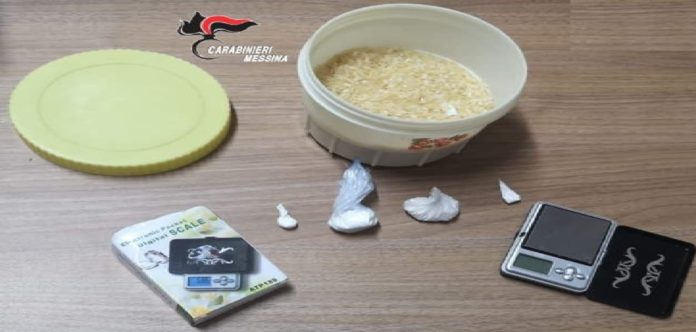 Nel primo pomeriggio di ieri, i Carabinieri hanno notato un giovane, giunto a bordo di uno scooter, entrare nel portone del condominio ove risiede C.C., uscendone poco dopo. Il giovane è stato sottoposto a controllo. A seguito della perquisizione personale e veicolare effettuata dai militari il ragazzo è stato trovato in possesso di una dose di sostanza stupefacente del tipo cocaina del peso di circa 0,3 grammi, confezionata in un involucro di cellophane di colore bianco termosaldato. Rinvenuto lo stupefacente, i Carabinieri hanno proceduto alla perquisizione all’interno del domicilio di C.C. circondando l’abitazione e controllando anche il retro del palazzo. Mentre i militari dell’Arma entravano in casa, il dispositivo di controllo all’esterno notava una donna, la madre dell’arrestato, che usciva velocemente dall’abitazione, dirigendosi nel cortile per occultare un contenitore per alimenti dietro un muretto. I Carabinieri hanno recuperato quel contenitore appurando che al suo interno vi era del riso crudo che nascondeva 2 involucri di cellophane di colore bianco contenenti complessivamente poco meno di 10 grammi di cocaina in polvere ed una dose del peso di circa 0,3 grammi confezionata nello stesso tipo di involucro termosaldato in cellophane di colore bianco che era stato poco prima recuperato addosso al giovane conducente dello scooter. Inoltre, nel corso della perquisizione è stato anche rinvenuto un bilancino di precisione. La sostanza stupefacente ed il bilancino sono stati sequestrati e C.C. è stato arrestato in flagranza di reato per detenzione ai fini di spaccio di cocaina e, su disposizione della Procura della Repubblica di Messina, è stato tradotto presso la Casa Circondariale di Messina “Gazzi” mentre il giovane consumatore è stato segnalato alla Prefettura di Messina per uso personale di sostanze stupefacenti.