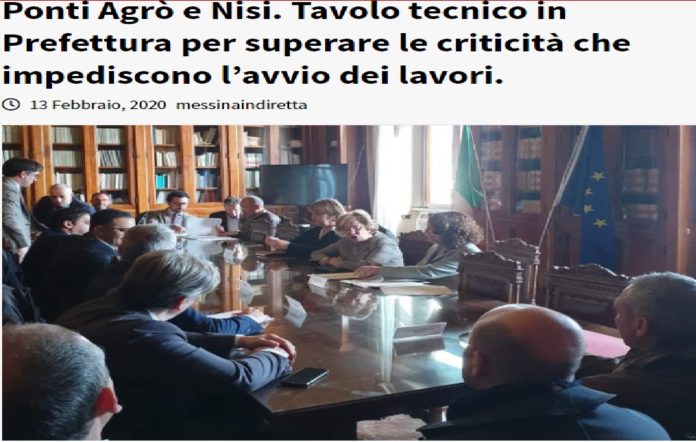In apertura dei lavori, il Prefetto ha preliminarmente sottolineato come gli interventi di ricostruzione delle predette strutture rivestano una particolare importanza per quelle comunità locali tenuto conto che il ponte Agrò assicura il collegamento viario tra i Comuni di Santa Teresa di Riva e Sant’Alessio Siculo e il ponte Nisi assicura il collegamento viario tra i Comuni di Alì Terme e Nizza di Sicilia, evidenziando l’urgenza di avviare al più presto i lavori in questione a tutela della pubblica incolumità e della sicurezza della circolazione stradale atteso che, in atto, le uniche vie di transito esistenti sono costituite da due bretelle provvisorie realizzate dall’A.N.A.S. sui torrenti Agrò e Fiumedinisi, che rischiano la chiusura in caso di eventi metereologici avversi.