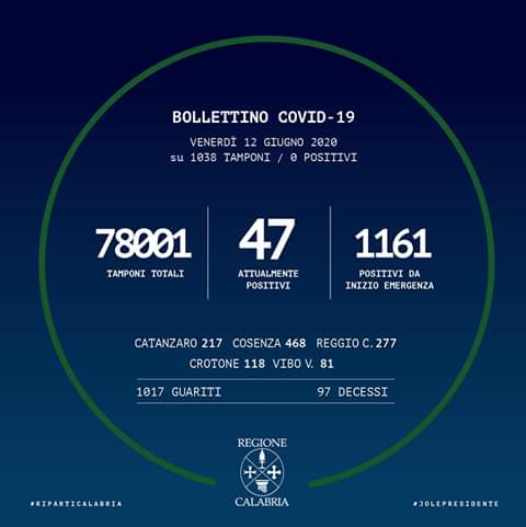 In Calabria ad oggi sono stati effettuati 78.001 tamponi. Le persone risultate positive al Coronavirus sono 1.161 (+0 rispetto a ieri), quelle negative sono 76.840.