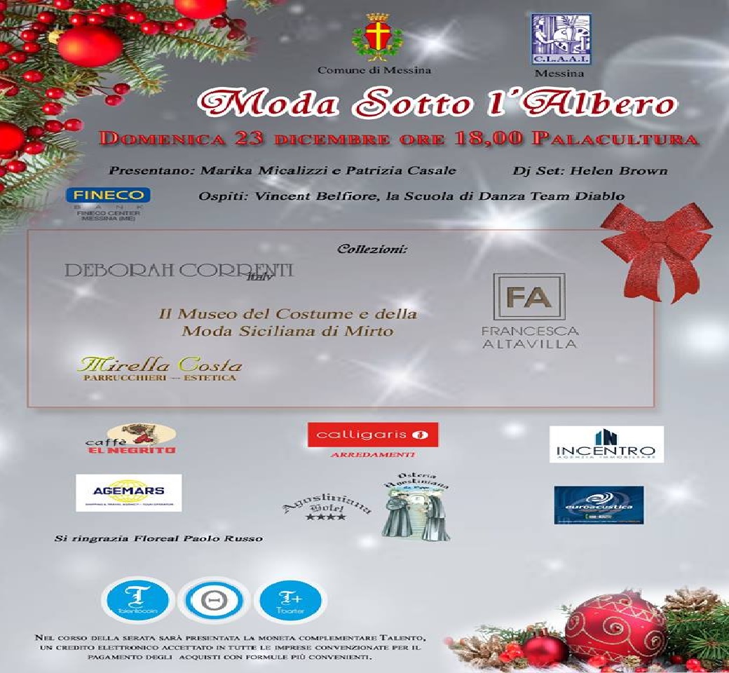 Alle ore 18 di oggi, presso il Palacultura Antonello di viale Boccetta a Messina, la la Claai con il patrocinio del Comune presenta lo spettacolo “Moda Sotto l’Albero”. Si tratta di una sfilata, nel corso della quale saranno premiati alcuni artigiani aderenti alla Claai che si sono evidenziati nel contesto della loro attività.