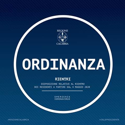 “Ho firmato l’ordinanza che consente ai residenti in #Calabria di rientrare a partire dal prossimo 4 maggio”. Lo ha affermato oggi, la governatrice regionale Jole Santelli.