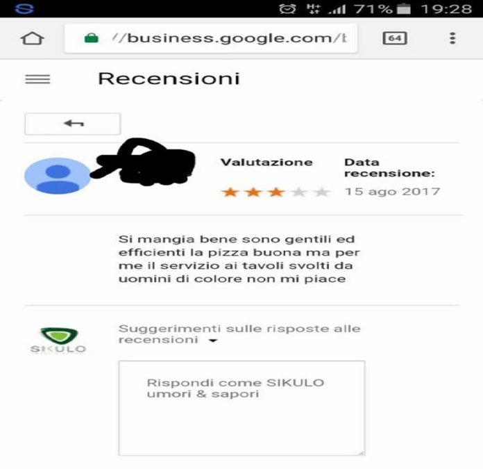 Questo, è il commento (condito da qualche errore grammaticale) che noi riportiamo fedelmente, lasciato da un cliente, attraverso l’applicazione di google dedicata alle recensioni che è stato postato nello spazio afferente “Sikulo Bistrot”, un locale di piazza Diodoro Siculo a Palermo.