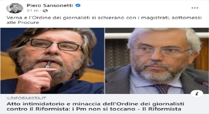 Ha detto che se un giornalista riferisce di un ricorso di Berlusconi contro un magistrato si merita di ricevere la censura dell’Ordine. Ha anche detto, di me, che sfido il ridicolo, usando un linguaggio che fin qui raramente avevo visto nelle esternazioni dei presidenti degli ordini professionali. Diciamo che Verna ha lanciato un avvertimento: state un po’ zitti, smettetela di criticare la magistratura, e vedrete che non succede niente. Se invece volete fare i pierini, sarete bastonati.