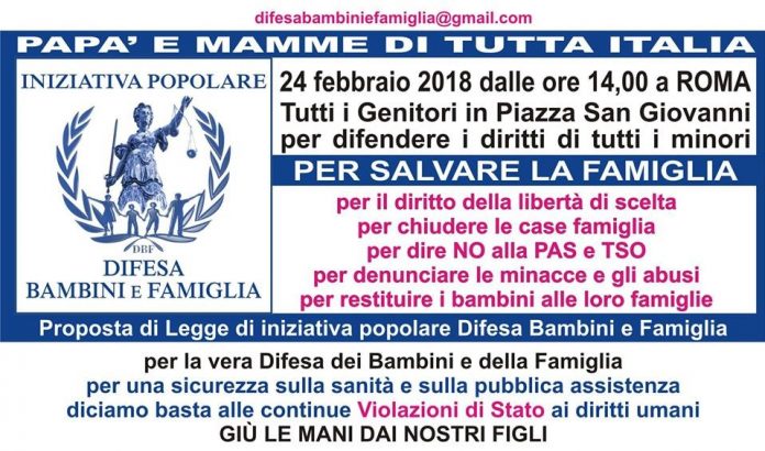 Il “Comitato Difesa Bambini e Famiglia”, terrà domani sabato 24 febbraio a Roma, una manifestazione alla quale sono convocati per partecipare tutti i genitori e tutti i giovani. L’evento, avrà luogo in piazza San Giovanni. Lo scopo di questa iniziativa, è quello di… salvare la famiglia per il diritto della libertà di scelta; per chiudere le case-famiglia; per dire no alla Pas ed al Tso; per denunciare le minacce e gli abusi; per restituire i bambini alle loro famiglie.