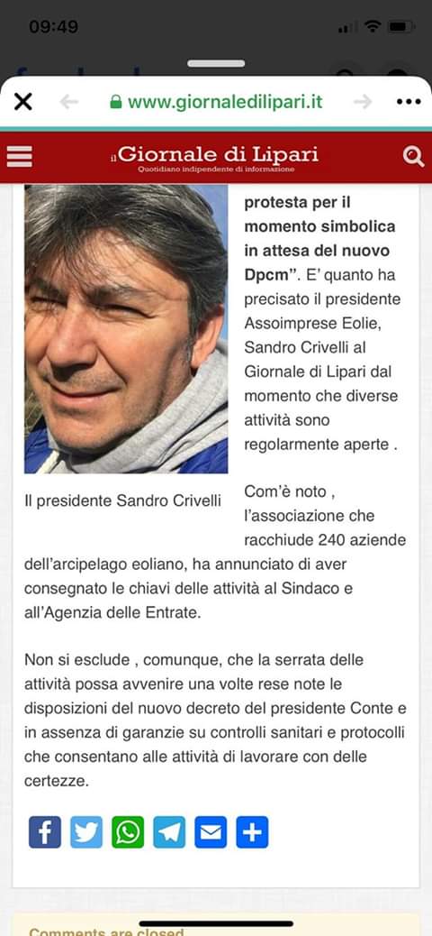AssoImprese, Sandro Crivelli (presidente di AssoImprese Eolie): “La consegna delle chiavi è un gesto al momento simbolico in attesa del Dpcm”. Lo ha dichiarato in una intervista (odierna), l’imprenditore che l’ha rilasciato al Giornale di Lipari.