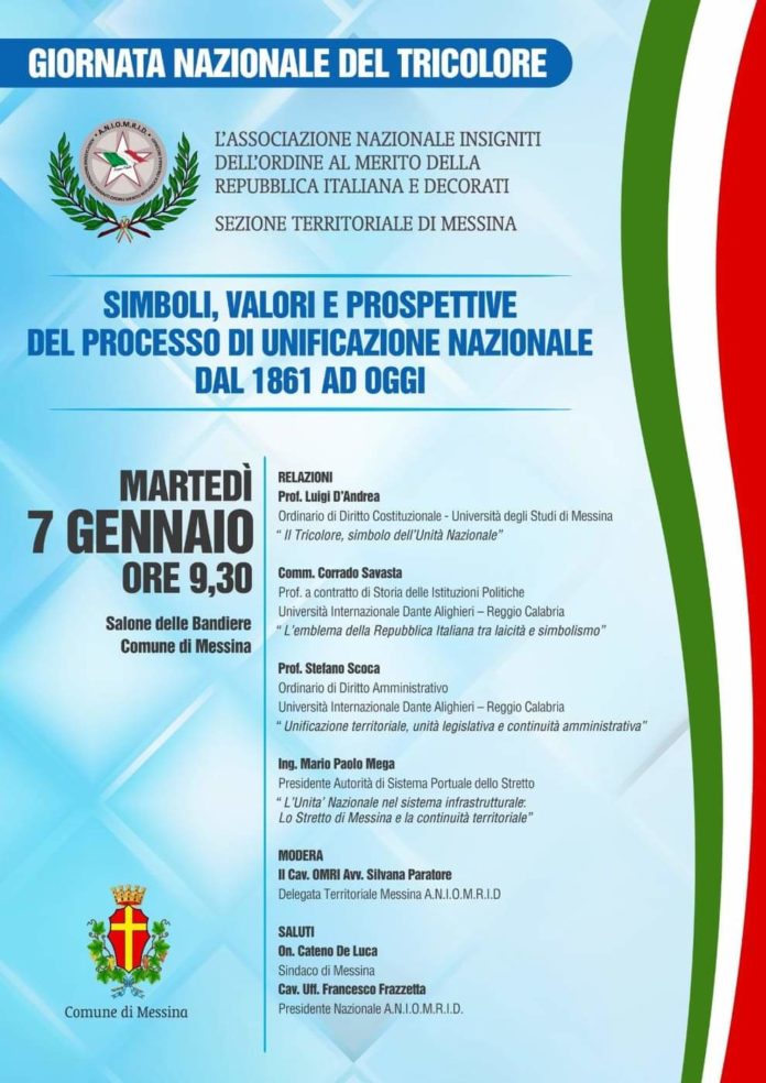 Prevista la tavola rotonda sul tema: Simboli, valori e prospettive del processo di unificazione nazionale dal 1861 ad oggi. L’evento promosso dall’A. N. I. O. M. R. I. D (Associazione Nazionale Insigniti dell’Ordine al Merito della Repubblica Italiana e Decorati) sezione territoriale di Messina col patrocinio del Comune di Messina sarà coordinato e moderato dal Delegato Territoriale A. N. I. O. M. R. I. D. Cav. Avv. Silvana Paratore.