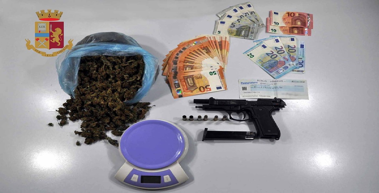 Nel corso delle attività di ricerca, gli operatori di Polizia hanno rinvenuto, occultata in una busta di cellophane, sul retro dell’abitazione, una prima parte di sostanza stupefacente. Il cinquantenne, infatti, aveva tentato di disfarsene all’arrivo dei poliziotti, ignaro della loro presenza lungo tutto il perimetro della casa. Una volta dentro, il personale operante ha iniziato a perquisire l’immobile rinvenendo un’altra confezione contenente ulteriore droga dello stesso tipo, che le successive analisi effettuate dal locale Gabinetto di Polizia Scientifica, hanno confermato essere marijuana allo stato erbaceo per un peso complessivo di 300,08 grammi. La perquisizione ha portato, altresì, al rinvenimento di un bilancino di precisione, di una terza confezione vuota e di una pistola a salve modello 92 F munita di tappo rosso e sei cartucce calibro 38. All’interno di un comò, è stata trovata la somma di euro 1275 in banconote di vario taglio. Lo stupefacente ed il restante materiale sono stati sequestrati e, in considerazione delle evidenze raccolte, l’uomo è stato arrestato dagli investigatori e – dopo la redazione dei necessari atti ed il rituale avviso al P.M. di turno della locale Procura della Repubblica – sottoposto agli arresti domiciliari a disposizione dell’Autorità Giudiziaria.