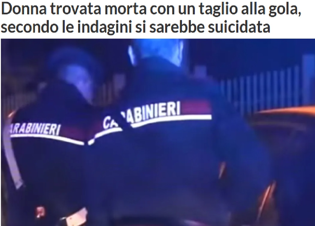 Quando uomini dell’Arma, vigili del fuoco e operatori del 118 sono entrati hanno trovato la donna con un taglio alla gola e un coltello nelle vicinanze. Il medico legale ha eseguito l’ispezione cadaverica. Non ci sarebbero dubbi sul fatto che si sia ammazzata.