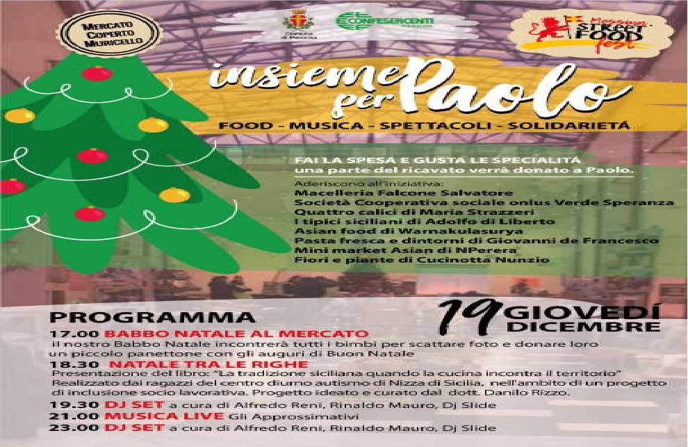 L’evento è patrocinato dal Comune di Messina e da Confesercenti Messina. Durante tutta la giornata chi andrà a fare la spesa, pranzerà o cenerà presso le attività del Mercato Muricello aderenti all’iniziativa contribuirà a raccogliere fondi da destinare a Paolo. Una parte dell’incasso sarà infatti a lui devoluta. L’organizzazione ha messo a disposizione anche le t-shirt brandizzate del Messina Street Food Fest, che verranno cedute in cambio di una piccola donazione. A partire dal pomeriggio sono inoltre previsti diversi appuntamenti. Alle 17 Babbo Natale incontrerà tutti i Bambini per scattare foto e donare loro piccoli panettoni. Si proseguirà alle 18.30 con “Natale tra le righe”, momento culturale dedicato alla presentazione del libro “La tradizione siciliana- quando la cucina incontra il territorio”. Il volume, nato da un progetto ideato e curato dal dott. Danilo Rizzo, è stato realizzato dai ragazzi del centro diurno per l’Autismo di Nizza di Sicilia nell’ambito di un programma di inclusione socio lavorativa.