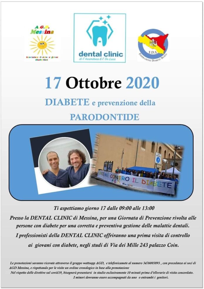 Si terrà Sabato 17 ottobre dalle ore 9:00 presso la Dental Clinic di Messina una giornata in favore delle persone con diabete, volta ad una prevenzione dentale completa promossa dall’Associazione Giovani diabetici di Messina presieduta da Armando Maggiari, in collaborazione con il Dott. Francesco Incardona e il Dott. Felice De Luca l’evento gode del patrocinio della Federazione Regionale diabete Sicilia.