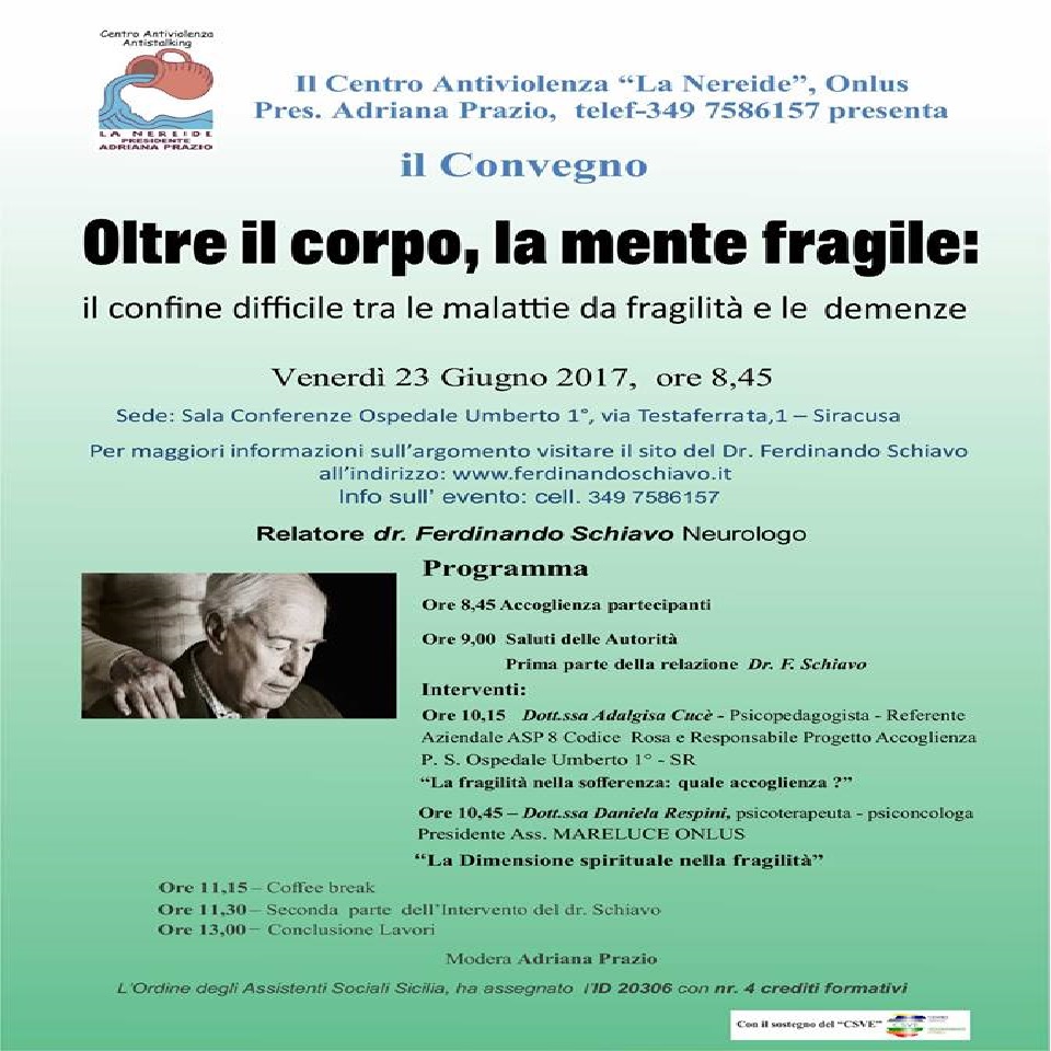 Il Centro Antiviolenza -La Nereide-, onlus di Siracusa (presieduto da Adriana Prazio), organizza per il prossimo 23 giugno presso la -Sala conferenze dell’Ospedale Umberto 1°-, il convegno dal titolo: “Oltre il corpo la mente fragile – il confine difficile, tra le malattie da fragilità e le demenze”.