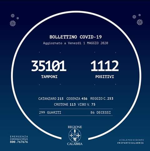 In Calabria ad oggi sono stati effettuati 35.101 tamponi. Le persone risultate positive al Coronavirus sono 1.112 (+4 rispetto a ieri), quelle negative sono 33.989.