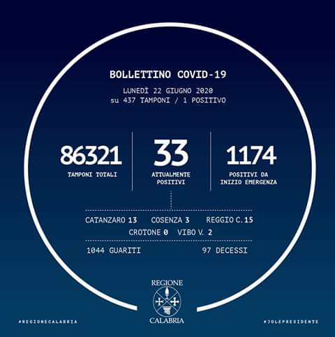 – Cosenza: 1 in reparto; 2 in isolamento domiciliare; 431 guariti; 34 deceduti.