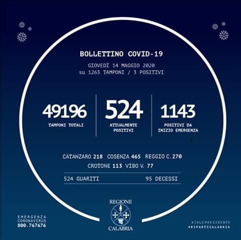 – Reggio Calabria: 8 in reparto; 1 in rianimazione; 117 in isolamento domiciliare; 127 guariti; 17 deceduti.