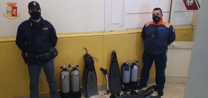 Sono stati individuati ieri dai poliziotti delle Volanti, su segnalazione della locale Capitaneria di Porto, in località Santa Margherita, al termine di una battuta di pesca subacquea, con ancora addosso la tuta da sub, tutta la necessaria attrezzatura per effettuare pesca subacquea e il pescato appena cacciato.