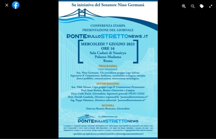 Su iniziativa del senatore Nino Germanà: conferenza stampa di presentazione del giornale…, “pontesullostrettonews.it”! L’evento…, si terrà il 7 giugno 2023 alle ore 16.00 a Roma presso la ‘Sala Caduti di Nassirya di Palazzo Madama’.