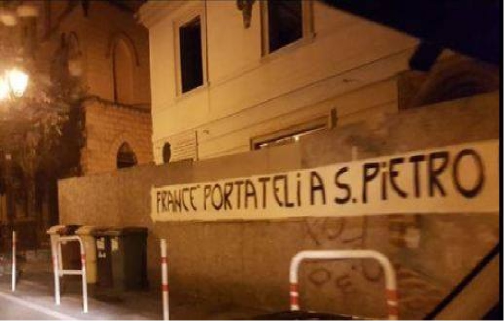 Sul luogo, sono state presenti le forze dell’ordine per garantire la sicurezza di tutti. Esprimendo la loro rabbia riferendosi a questo arrivo di stranieri, alcuni hanno esposto uno striscione (fotografato dall’operatore della Testata giornalistica Leggo, che alleghiamo) contro Papa Francesco, affermando: “Francé portateli a san Pietro”.