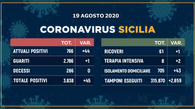 Oggi sono 45 i nuovi positivi in Sicilia. Più della metà riguardano la provincia di Catania: 23; così la ripartizione degli altri casi: 10 a Palermo (tutti migranti sbarcati a Lampedusa), 7 a Ragusa, 2 a Messina e 1 ciascuno ad Agrigento, Siracusa e Trapani.