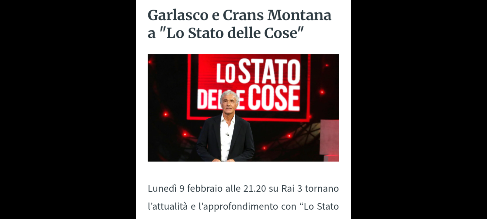 - ‘Sulla strage di Crans Montana resta alta la tensione tra Italia e Svizzera. In attesa degli interrogatori di Jacques e Jessica Moretti, previsti per la prossima settimana, la lettera che hanno inviato ai loro dipendenti fa infuriare le famiglie delle vittime. Se ne parla con l’ex senatore svizzero Filippo Lombardi, il parlamentare Toni Ricciardi, il direttore de Il Giornale, Tommaso Cerno, e i genitori di Trystan, una delle vittime del rogo di Capodanno’;