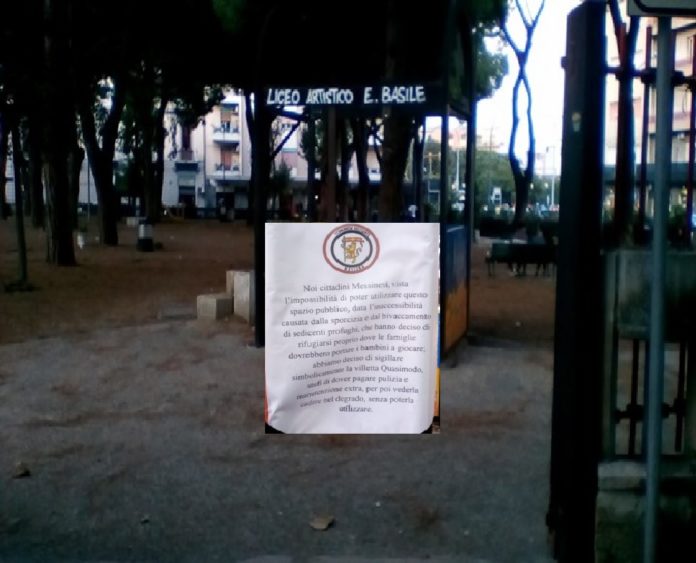 Nel documento firmato da Ialacqua, si legge: “intorno alle ore 9.30 circa di oggi, mi è stato segnalato per le vie brevi nel mio assessorato da alcuni operatori dell’Ufficio Verde ed Arredo Urbano del comune di Messina che questa mattina il custode della villetta Quasimodo (detta Royal) di via Tommaso Cannizzaro non ha potuto aprire il cancello principale della villetta in quanto chiuso da una catena con lucchetto sovrastata da un cartello, nel quale si manifestava la disapprovazione di un sedicente comitato -Comunità militante Messina- per la presenza quotidiana di immigrati nella villetta che, causa il -bivaccamento- e la sporcizia che determinerebbero, lederebbe il diritto dei cittadini di usufruire dello spazio verde”.