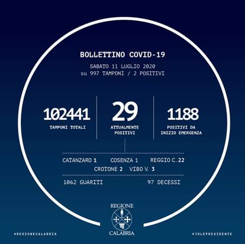 In #Calabria ad oggi sono stati effettuati 102.441 tamponi. Le persone risultate positive al Coronavirus sono 1.188 (+2 rispetto a ieri), quelle negative sono 101.253.