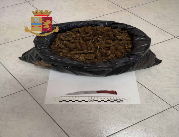 Poco dopo e poco distante dai luoghi del controllo, i poliziotti hanno rinvenuto un sacchetto contenente più di un kg e mezzo di marijuana. L’involucro contenente la sostanza stupefacente era stato nascosto all’interno di un canale di scolo delle acque reflue lungo la rampa di accesso ai caselli autostradali. Dopo il rinvenimento, gli agenti hanno immediatamente organizzato un servizio di appostamento congiunto che, nel corso della notte, ha dato i suoi frutti e rivelato l’identità del proprietario della droga. Intorno alle 01.00 infatti, gli agenti hanno avvistato e arrestato il quarantottenne sottoposto a controllo in serata intento a recuperare la marijuana. Sequestrato, altresì, un coltello di cm 16,5 con lama di 7,5 che l’uomo teneva nelle tasche dei pantaloni. Lo stesso, su disposizione dell’Autorità Giudiziaria, è stato sottoposto agli arresti domiciliari.