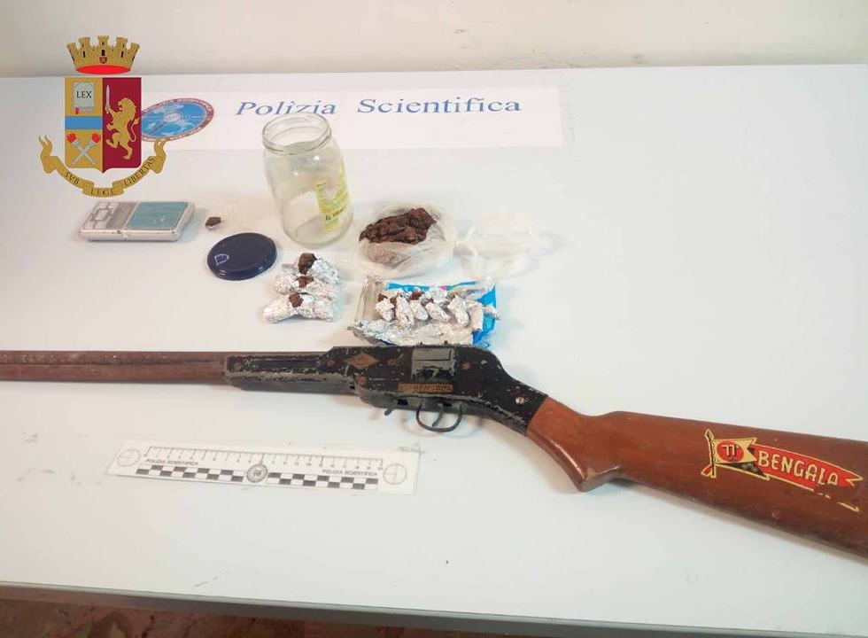 Quando gli agenti si sono presentati, il cinquantaquattrenne ha temporeggiato ad aprire la porta di casa, nel vano tentativo di nascondere il barattolo in cui teneva la droga e di disfarsi di un fucile che poi si è rivelato essere un’arma giocattolo priva di tappo rosso. Su disposizione dell’Autorità Giudiziaria, l’uomo è stato sottoposto al regime degli arresti domiciliari in attesa del rito direttissimo previsto nella giornata odierna.