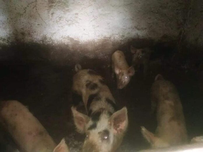 Nella stalla abusiva, realizzata con materiale precario, c’erano suini a cui i veterinari hanno apposto orecchini identificativi e fatto prelievi di sangue per verificarne le condizioni di salute.