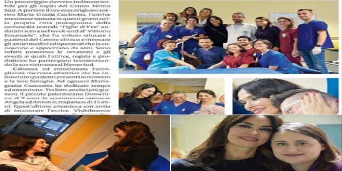 Il NeMO SUD è oggi riferimento per i pazienti affetti da patologie neuromuscolari in tutto il Sud Italia. Tra degenze, day hospital e visite ambulatoriali ha conosciuto, in poco più di 6 anni di attività, circa 4.000 persone. Il paziente è seguito da un team multidisciplinare di specialisti in neurologia, fisiatria, pneumologia, fisioterapia, logopedia e psicologia. Maria Grazia Cucinotta ha come sempre dimostrato di essere una persona di grande sensibilità. L’attrice è rimasta accanto ai pazienti per più di 3 ore, donando loro speranza, sorrisi e conforto. Sarà questo un incontro davvero indimenticabile per molti al NeMO SUD. Maria Grazia Cucinotta ha donato una splendida testimonianza di amore per la propria città e per ciò che di buono nasce e cresce in questo nostro Sud. Seppure con tante difficoltà.