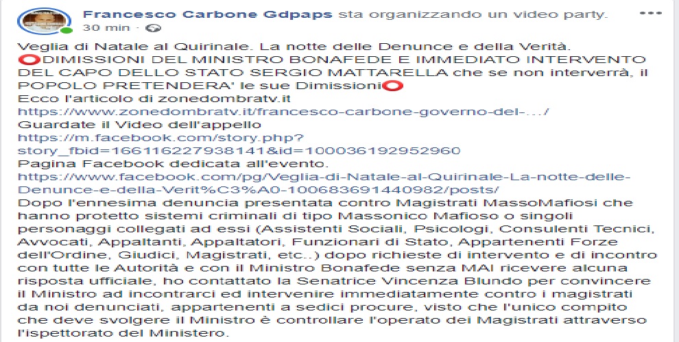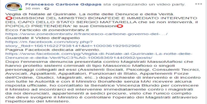 “Veglia di Natale al Quirinale, oggi 24 dicembre 2019. La notte delle Denunce e della Verità”. Lo scrive su Facebook, il presidente dell’Associazione di promozione sociale (della Provincia di Palermo) Governo del Popolo Francesco Carbone.