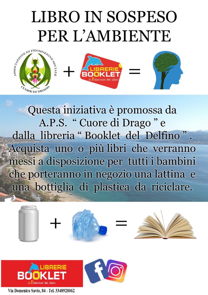 Partirà lunedì 17 giugno “Libro in sospeso per l’ambiente”, il progetto organizzata dall’Associazione di Promozione Sociale (A.P.S.) “Cuore di Drago” e dalla Libreria Booklet del Delfino per replicare anche qui a Messina l’iniziativa realizzata dal Libraio Michele Gentile a Polla: gli alunni delle scuole elementari e medie potranno portare, presso la libreria, 1 bottiglia di plastica e 1 lattina di alluminio in modo che possano essere correttamente smaltiti, ricevendo in cambio uno dei libri accantonati in precedenza dalla libreria.