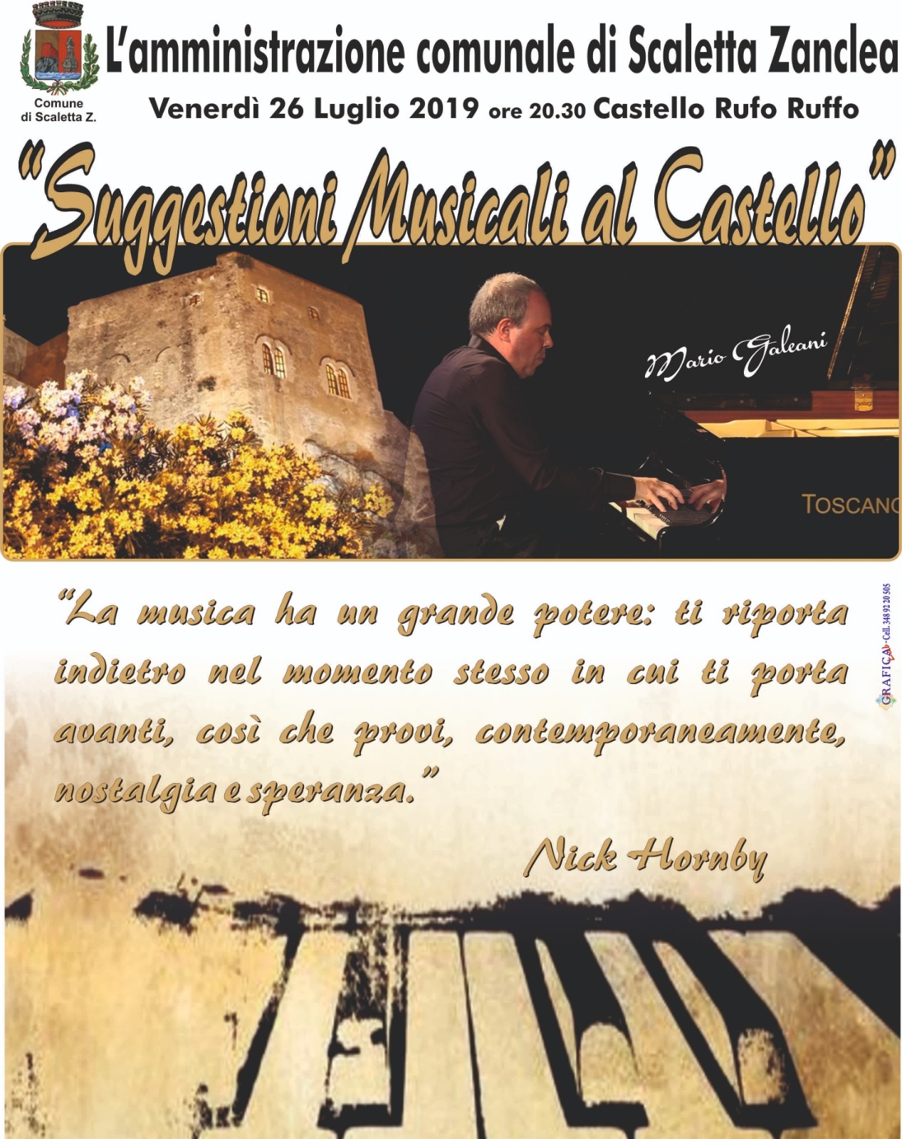 “Ogni volta che tengo un concerto nella mia terra è sempre una grande emozione per me. Il Castello Rufo Ruffo di Scaletta, luogo storico della nostra Sicilia e che domina dall’alto la costa jonica, sarà la suggestiva cornice alle melodie romantiche e appassionate del mio concerto” sostiene il pianista Mario Galeani.