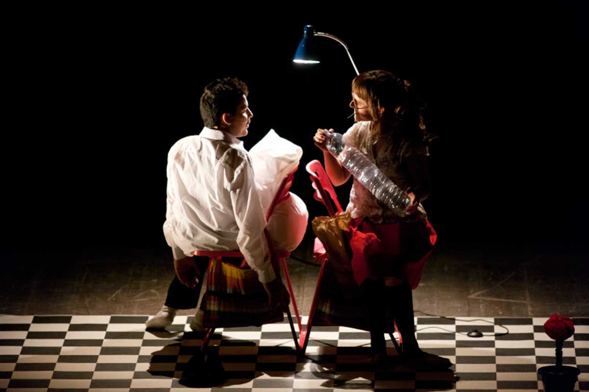 “Due passi sono” (regia, testi ed interpretazione del reggino Giuseppe Carullo e della messinese Cristiana Minasi, scene e costumi Cinzia Muscolino, disegno luci Roberto Bonaventura, aiuto regia Roberto Bitto, produzione Carullo-Minasi e Il Castello di Sancio Panza), racconta le gesta di due piccoli esseri umani: un uomo e una donna. I due si ritrovano sul grande palco dell’esistenza, nascosti nel loro mistero di vita che li riduce dentro uno spazio sempre più̀ stretto, dall’arredamento essenziale, stranamente deforme, alla stregua dell’immaginario dei bimbi in fase febbricitante. Attraversano le sezioni della loro tenera e terribile, goffa e grottesca vita/giornata condivisa. Sembrano essere chiusi in una scatoletta di metallo, asettica e sorda alle bellezze di cui sono potenziali portatori, ma un “balzo” – nonostante le gambe molli – aprirà̀ la custodia del loro carillon. Fuoriescono vivendo il sogno della vera vita da cui non è più necessario sfuggire, ma solo vivere, con la grazia e l’incanto di chi ha imparato ad amare la fame, la malattia, i limiti dello stare. Immagine-cripta sacra, surreale e festosa, quella del loro matrimonio, dove come in una giostra di suoni, colori e coriandoli, finiranno per scambiarsi meravigliosi propositi di poesia.
