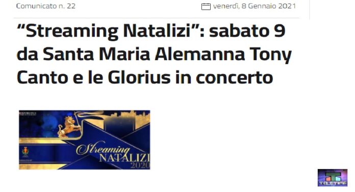 Lo spettacolo “Natale VentiVenti” in programma domani, sabato 9, da Santa Maria Alemanna con Tony Canto e le Glorius, concluderà la rassegna “Streaming Natalizi” nell’ambito del cartellone degli eventi promossi dall’Amministrazione comunale. Il concerto sarà trasmesso alle 18 sulla pagina facebook “Kulturavirus” gestita dal Comune di Messina, e sulle emittenti locali Tcf sempre alle 18, e Rtp alle 21.